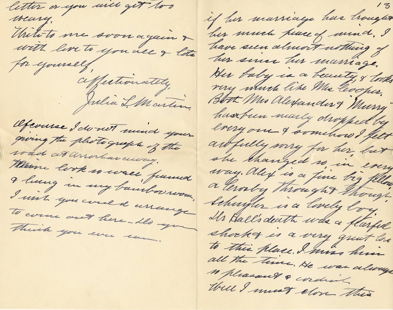 letter or you will get too weary. Write to me soon again & with love to you all & lots for yourself, affectionately, Julia L. Martin Of course I do not mind your giving the photograph of the road at Arranbarcaway. Therine looks so well, framed & hung in my boudoir room. I wish you could arrange to come out here—do you think you ever can. If her marriage has brought her much peace of mind, I have seen almost nothing of her since her marriage. Her baby is a beauty, & looks very much like Mrs. Coopes. Both Mrs. Alexander & "Murry" have been nearly dropped by everyone & somehow I feel awfully sorry for her, but she changed so, in every way. Ally is a fine big fellow, a lovely thought though. Schuyler is a lovely boy. Mr. Ball's death was a fearful shock & is a very great loss to this place. I miss him all the time. He was always so pleasant & cordial. Well I must close this