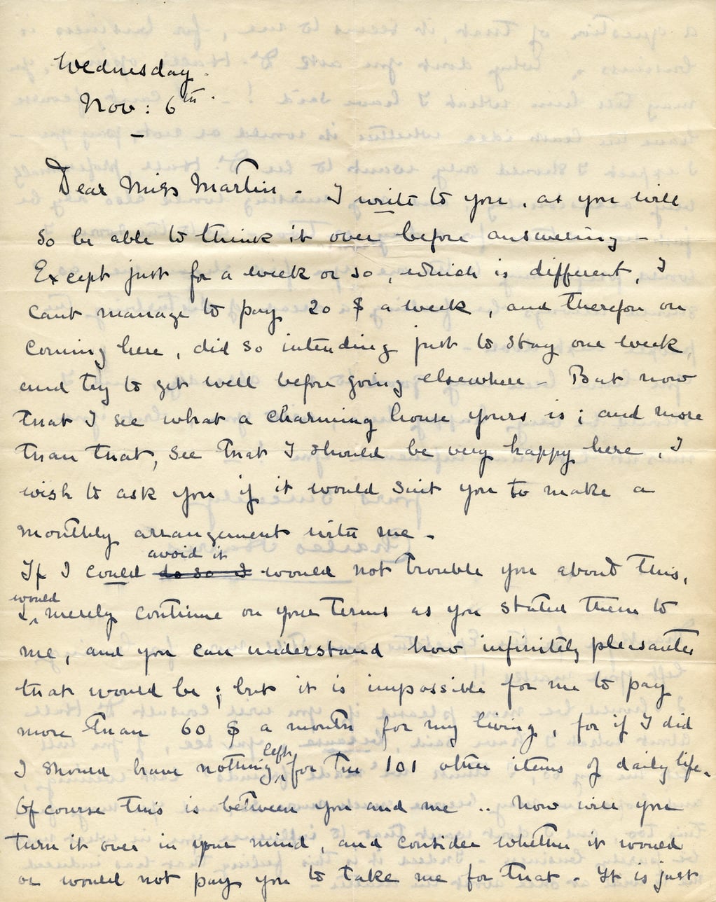 Wednesday. Nov: 6th. Dear Miss Martin, I write to you, as you will so be able to think it over before answering—Except just for a week or so, which is different. I can't manage to pay 20 $ a week, and therefore am coming here, did so intending just to stay one week and try to get well before going elsewhere. But now that I see what a charming house yours is; and more than that, see that I should be very happy here, I wish to ask you if it would suit you to make a monthly arrangement with me. If I could avoid it, I would not trouble you about this. I would merely continue on your terms as you stated them to me, and you can understand how infinitely pleasant that would be; but it is impossible for me to pay more than 60 $ a month for my living, for if I did I should have nothing left for the 101 other items of daily life. Of course this is between you and me... Now will you turn it over in your mind, and consider whether it would or would not pay you to take me for that. It is just