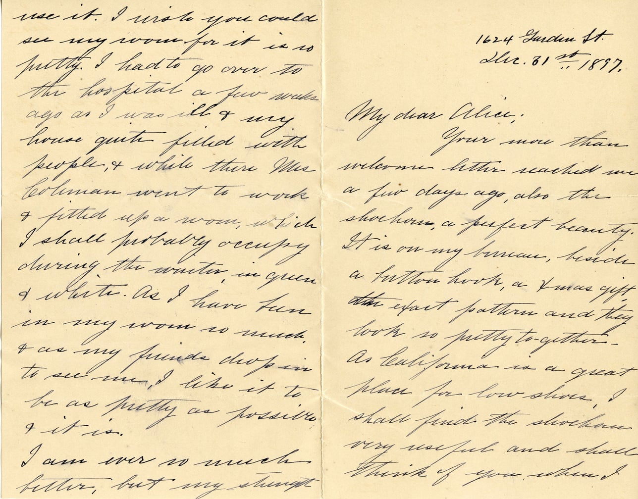 use it. I wish you could see my room for it is so pretty. I had to go over to the hospital a few weeks ago as I was ill & my house quite filled with people, & while there Miss Coleman went to work & fitted up a room, which I shall probably occupy during the winter in green & white. As I have fun in my room so much, & as my friends drop in to see me, I like it to be as pretty as possible & it is. I am ever so much better, but my strength 1624 Garden St. Dec. 81st 1897. My dear Alice, Your more than welcome letter reached me a few days ago, also the shoe horn, a perfect beauty. It is on my bureau, beside a button hook, a & mas gift then exact pattern and they look so pretty together. As California is a great place for low shoes, I shall find the shoe horn very useful and shall think of you when I