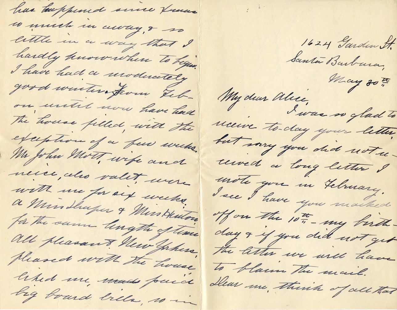 has happened since you were so much in away, & so little in a way that I hardly know when to begin. I have had a moderately good winter. From Feb. on until now have had the house filled, with the exception of a few weeks. Mr John Mott, wife and niece, also valet, were with me for six weeks. A Miss Shaper & Miss Hinton, for the same length of time. All pleasant & New Yorkers, pleased with the house liked me, mass pec's big board bills, so in 1624 Garden St. Santa Barbara, May 30th My dear Alice, I was so glad to receive today your letter, but sorry you did not receive a long letter I wrote you in February. I see I have you marked off on the 10th - my birthday & if you did not get the letter we will have to blame the mail. Dear me, think of all that