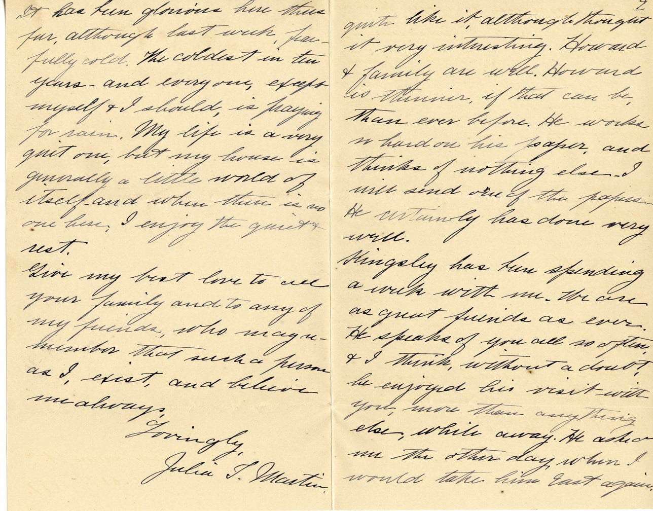 It has been glorious here thus far, although last week fearfully cold. The coldest in ten years—and everyone, except myself & I should, is paying for rain. My life is a very quiet one, but my house is generally a little world of itself and when there is no one here, I enjoy the quiet & rest. Give my best love to all your family and to any of my friends, who may remember that such a person as I exist, and believe me always. Lovingly, Julia T. Martin quite like it, although thought it very interesting. Howard & family are well. Howard is thinner, if that can be, than ever before. He works so hard on his paper, and thinks of nothing else—I will send one of the papers. He certainly has done very well. Kingsley has been spending a week with me. We are as great friends as ever. He speaks of you all so often & I think, without a doubt, he enjoyed his visit with you more than anything else, while away. He asked me the other day when I would take him East again.