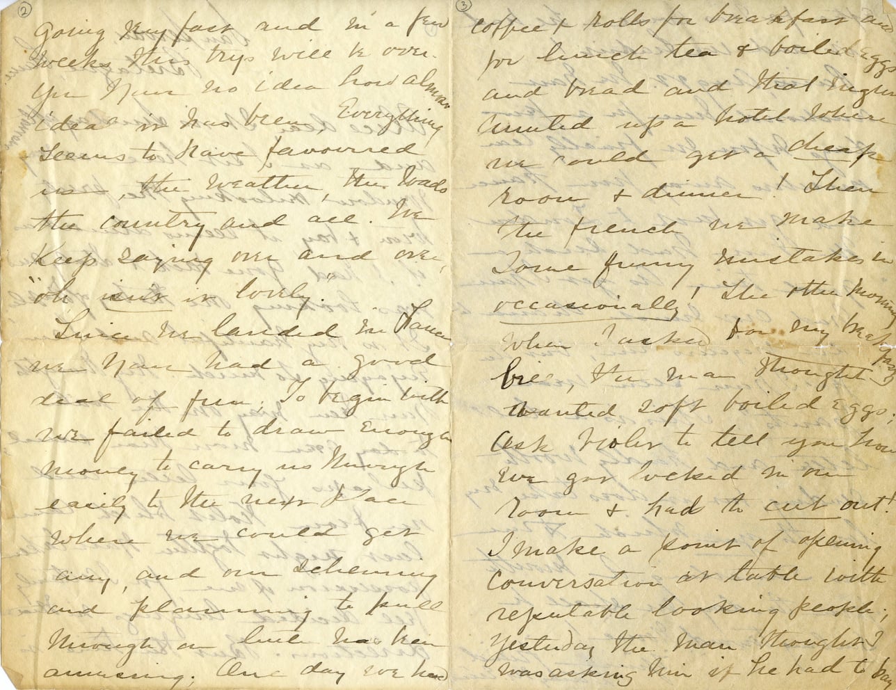 Going very fast and in a few weeks this trip will be over. You have no idea how almost ideas it has been. Everything seems to have favoured us, the weather, the roads, the country and all. We keep saying one and one, "Oh isn't it lovely." Lucie & I landed in France & you had a good deal of fun; so began with us failed to draw enough money to carry us through easily to the next place where we could get money, and our scheming and planning to pull through on luck has been amusing. One day we have coffee & rolls for breakfast and for lunch tea & boiled eggs and bread and that night we settled up a hotel where we could get a cheap room & dinner! Then the French we make some funny mistakes occasionally. The other morning when I asked for my Mek bie, she was thought I wanted soft boiled eggs; ask Victor to tell you how ever got locked in our room & had the cut out! I make a point of opening conversation at table with reputable looking people; yesterday the Ma'am thought I was asking him if he had to buy