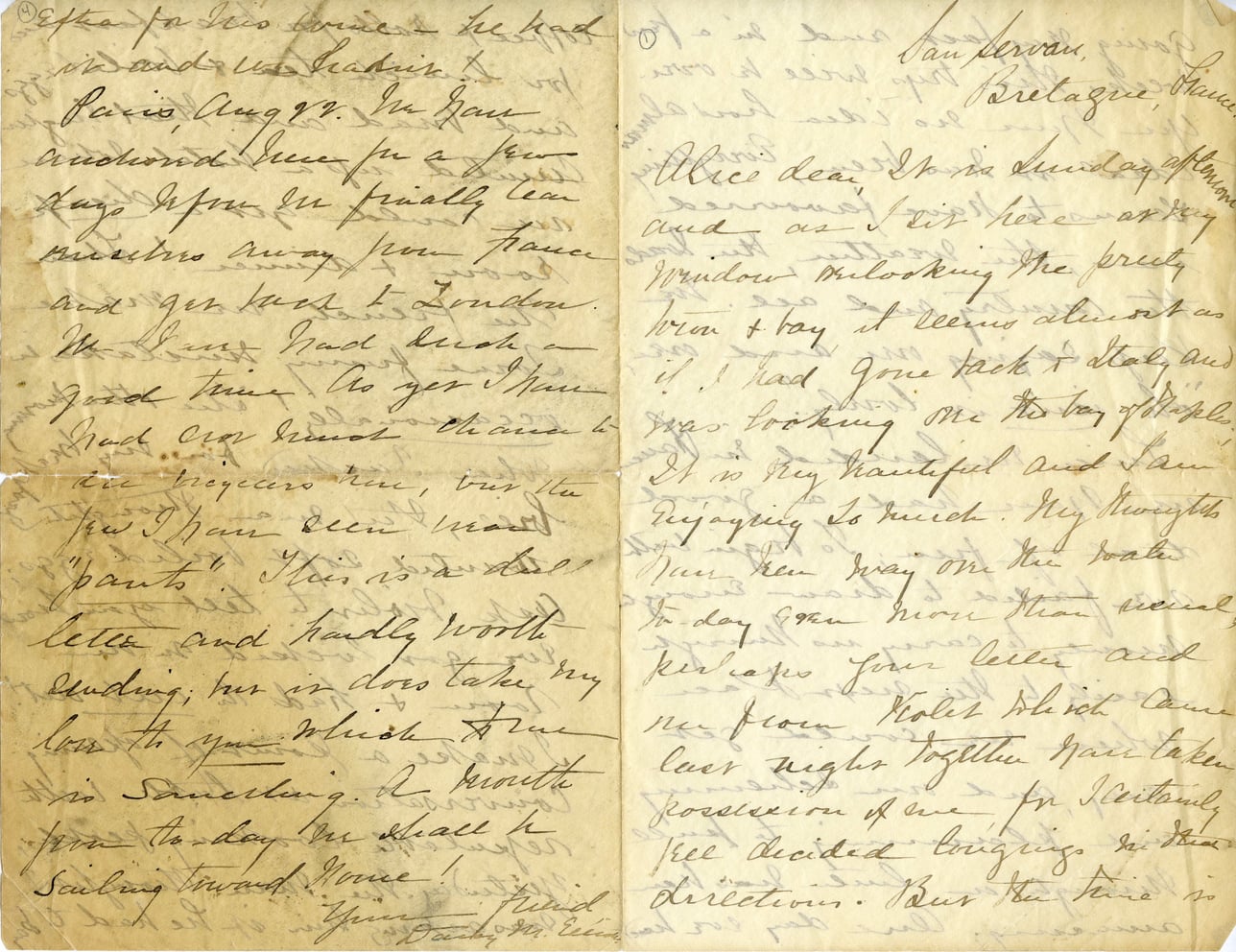 @daisy_elliot -> experienced -> @travel_experience:concept {description: "Victorian-era European travel with social observations"}Paris, Aug 20. In Paris and now in London. I am glad to hear you are finally free from cares away from France and get back to London. Mr. Dunn had such a good time. As yet I have had even fewer chances to see foreigners here, but the few I have seen wear "pants." This is a dull letter and hardly worth sending; but it does take my love to you which I am in Saumur. A month from today we shall be sailing toward home! Your friend, Daddy W. Ewing San Servan, Bretagne, France. Alice dear, It is Sunday afternoon and as I sit here at my window unlooking the pretty town & bay it seems almost as if I had gone back to Italy and was looking over the Bay of Naples. It is very beautiful and I am enjoying so much. My thoughts have been way over the water today even more than usual, perhaps youreller and me from Violes which came last night together have taken possession of me for certainly I've decided longing in that direction. But the time is