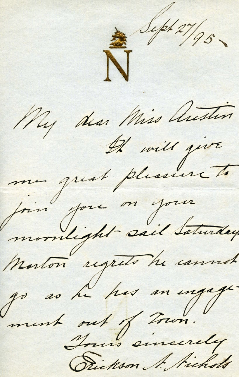 @invitation_letter -> includes -> @morton {role: "Regretted attendee"}Sept 27/95 My dear Miss Austin, It will give me great pleasure to join you on your moonlight sail Saturday. Morton regrets he cannot go as he has an engagement out of town. Yours sincerely, Ericson A. Nichols