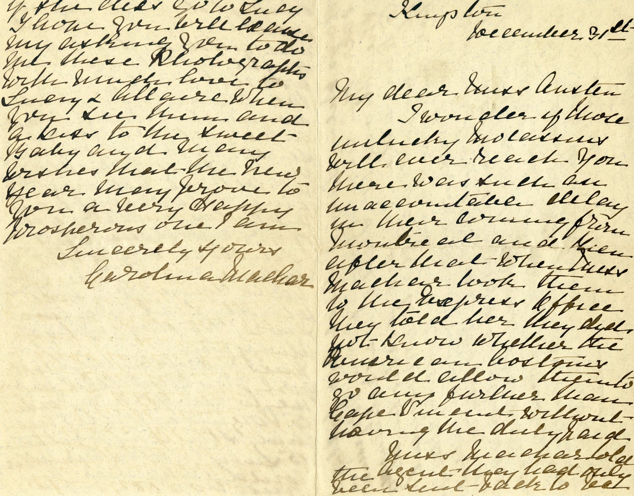 @carolina -> wrote letter to -> @alice_austen {date: @date_1896_12_21, location: @kingston}