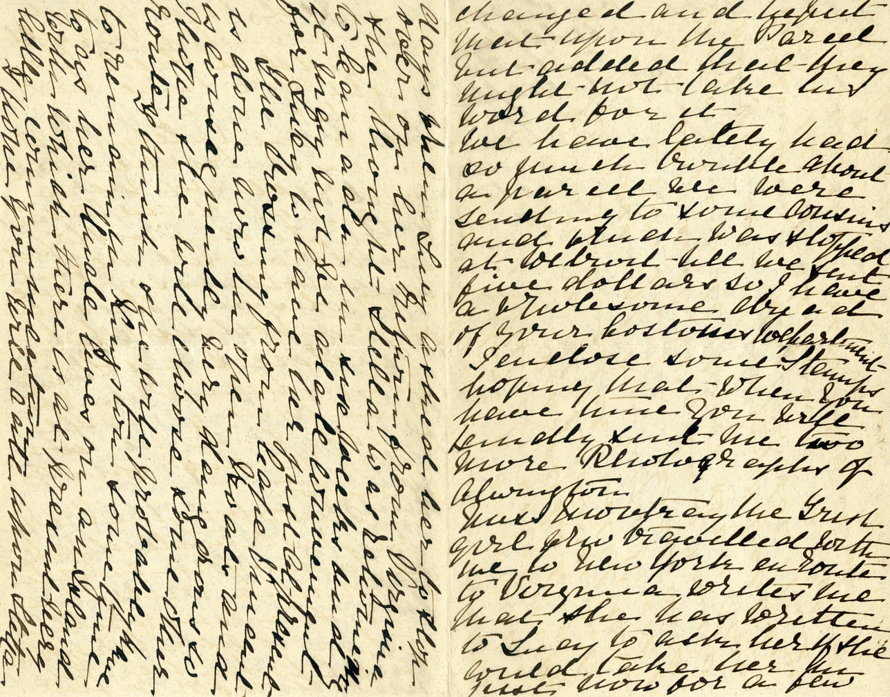 Maggie showed such criticalness to poor sister, and her rejoicing over Virginia's marriage she thought Mabel was delighted to hear of. We were greatly struck at it in my last but we are so accustomed to go about to hear our good old friend the Maumee from day to day that we never knew her there before now. We could scarcely keep our chairs to settle hers. We had a good evening and very pleasant lecture the next night. Mrs. G. lived with us at Crewe these last few weeks. My cousin Ellen was quite well when she left home. You will see all when she gets changed and expect that upon the parcel just packed that they might not take her word for it. We have lately had so much trouble about the parcel we were sending to some cousins and friends. We stopped at Weidert hill we sent five dollars so I have a welcome oby and of your brother Robert and Genevieve some stamps hoping that when you write you will send me two more photos after of Alwyn for. Miss Dorothy the first girl who travelled with me to New York en route to Virginia writes me that she has written to Lucy to ask her if she would take her for just now for a few
