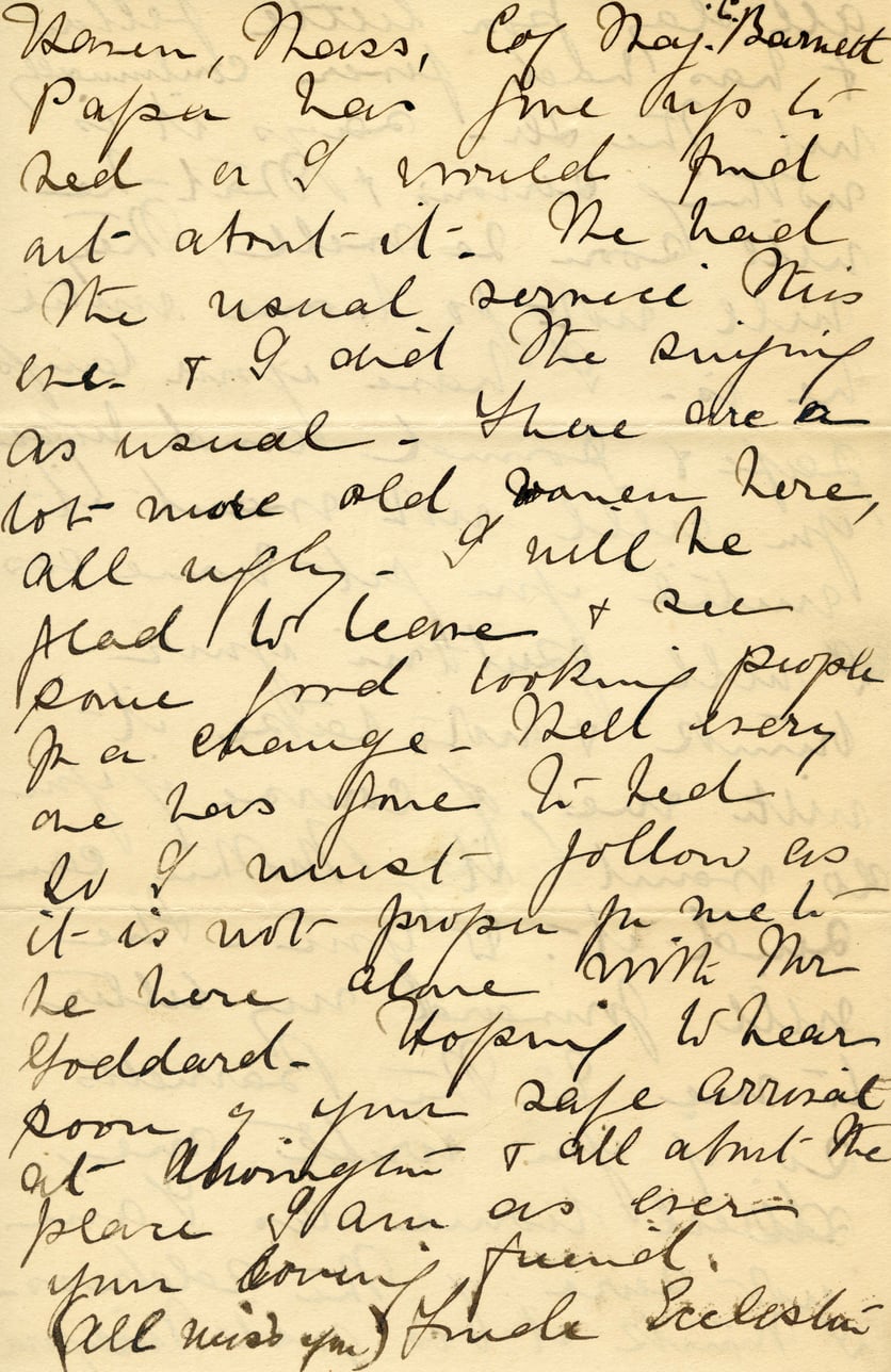 @trude_eccleston_correspondence_collection -> held by -> @alice_austen_house_museumWomen, News, Co. May. Barnett Papa & I would find out about it. We had the usual service this week & I did the singing as usual. There are a lot more old women here, all ugly. I will be glad to leave & see some good looking people for a change. Well everyone has gone to bed so I must follow as it is not proper for me to be here alone with Mr. Goddard. Hoping to hear soon of your safe arrival at Abingdon & all about the place I am as ever your loving friend. (All miss you) Uncle Celestia