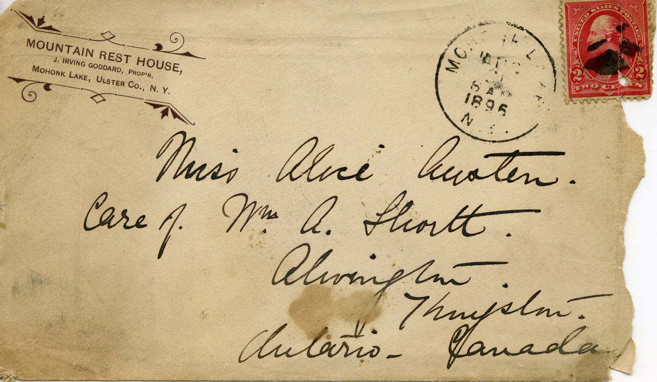 MOUNTAIN REST HOUSE, J. IRVING GODDARD, PROP'IR. MOHONK LAKE, ULSTER CO., N.Y. Miss Alice Weston Care of Mrs. A. Shortt Alvington Thynston Ontario - Canada