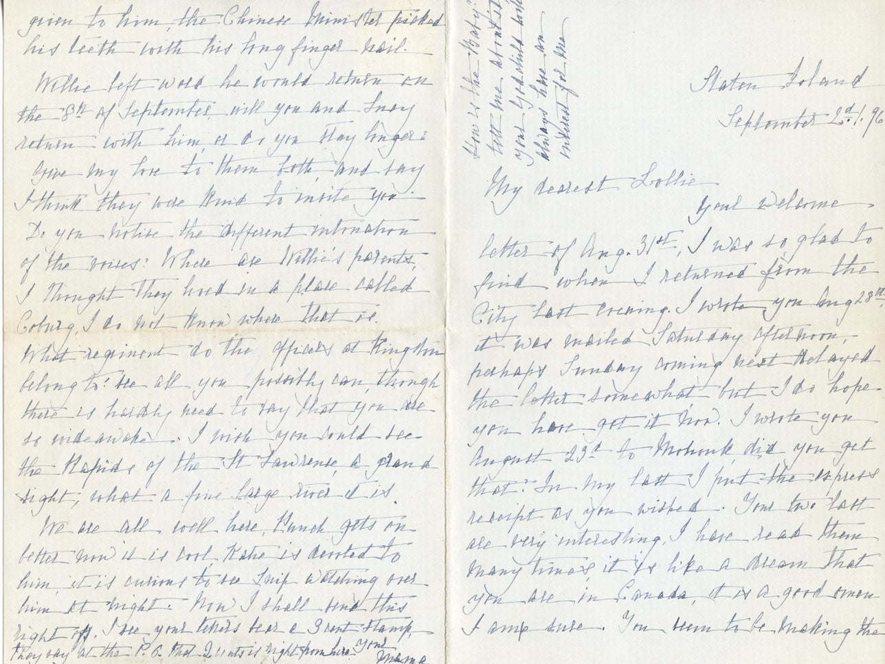 given to him, the Chinese minister picked his teeth with his long finger nail. Willie left word he would return on the 8th of September, will you and Lucy return with him or do you stay longer? Give my love to them both, and say I think they were kind to invite you. Do you notice the different intonation of the voices? Where are Willie's parents? I thought they lived in a place called Colong. I do not know where that is. What regiment do the officers at Kingston belong to? Tell all you possibly can, though there is hardly need to say that you are so wide awake. I wish you could see the Rapids of the St Lawrence, a grand sight; what a fine large river it is. We are all well here. Punch gets on better now it is cool, Kate is dressed to him, it is curious to see Soup watching over him at night. Now I shall send this right off. I see your letters here & I sent Stamp, they say at the P.O. that I want it right from here. When Slater Island September 24, 196 My dearest Lottie, Your welcome. Letter of Aug. 31st, I was so glad to find when I returned from the City last evening. I write you Aug. 28th, it was mailed Saturday afternoon, perhaps Sunday coming next. I delayed the letter somewhat but I do hope you have got it now. I wrote you August 23rd to Mohawk, did you get that? In my last I put the express receipt as you wished. Your two last are very interesting. I have read them many times, it is like a dream that you are in Canada, it is a good one I am sure. You seem to be missing the