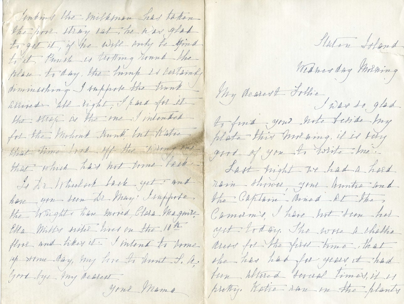 Staten Island Wednesday Morning My Dearest Lottie, I was so glad to find your note beside my plate this morning, it is very good of you to write me. Last night we had a hard rain, showers, your blouse and the Captain arrived at the Cameron's, I have not been back yet today. She wore a chilie dress for the first time that she has had for years, it had been altered several times, it is pretty. Katie ran in the plants. Sinking the milkman has taken the poor stray cat, he was glad to get it, if he will only be kind to it. Punch is trotting round the place today, the bump is certainly diminishing. I suppose the trunk arrived all right, I have got it. The step is the one I intended for the Michael trunk, but Katie that time took off the wrong one that which has not come back. Is Dr Wheelock back yet? and have you seen Dr May? I suppose the Wrights have moved, Clara Maguire, Ella Willis sister lives on the 10th floor and likes it. I intend to come up some day, my love to Aunt S.A., goodbye my dearest. Yours Mama