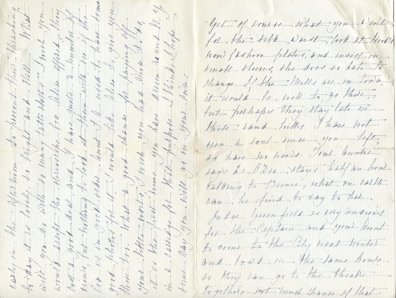 Early in the afternoon to prevent their thrashing for day it is pitchy, & flight and Hill. What will you do with so many little photos? I wish you would bring the Microscope for Alice offered, they are a great deal, and if have quite a number of friends, put something to look at them with, too. If the fine day in getting better, Aunt J.R. noted to have some good weather for it. I would like Alice to give you these $40. What a good chance you having off your little sister, if with you had a girl to help, it in the first time you have driven around N.Y. in a carriage for that purpose I think it'll help some—Any you will go on your side. Get of course what you want for the silk waist, look at Ann's new fashion plates, and insist on small sleeves, she does so hate to change. If the Mills are in town, it would be well to go there, but perhaps they stay late in those sand hills. I have not seen A tonl since you left, so have no news. Your Auntie says Dr. O'ke stays half an hour talking to Frannie, what an ear he can, he said to say to her Judge Greenfield is very anxious for the Captain and your Aunt to come to the City next winter and board in the same house, so they can go to the theatre together, but much chance of that.
