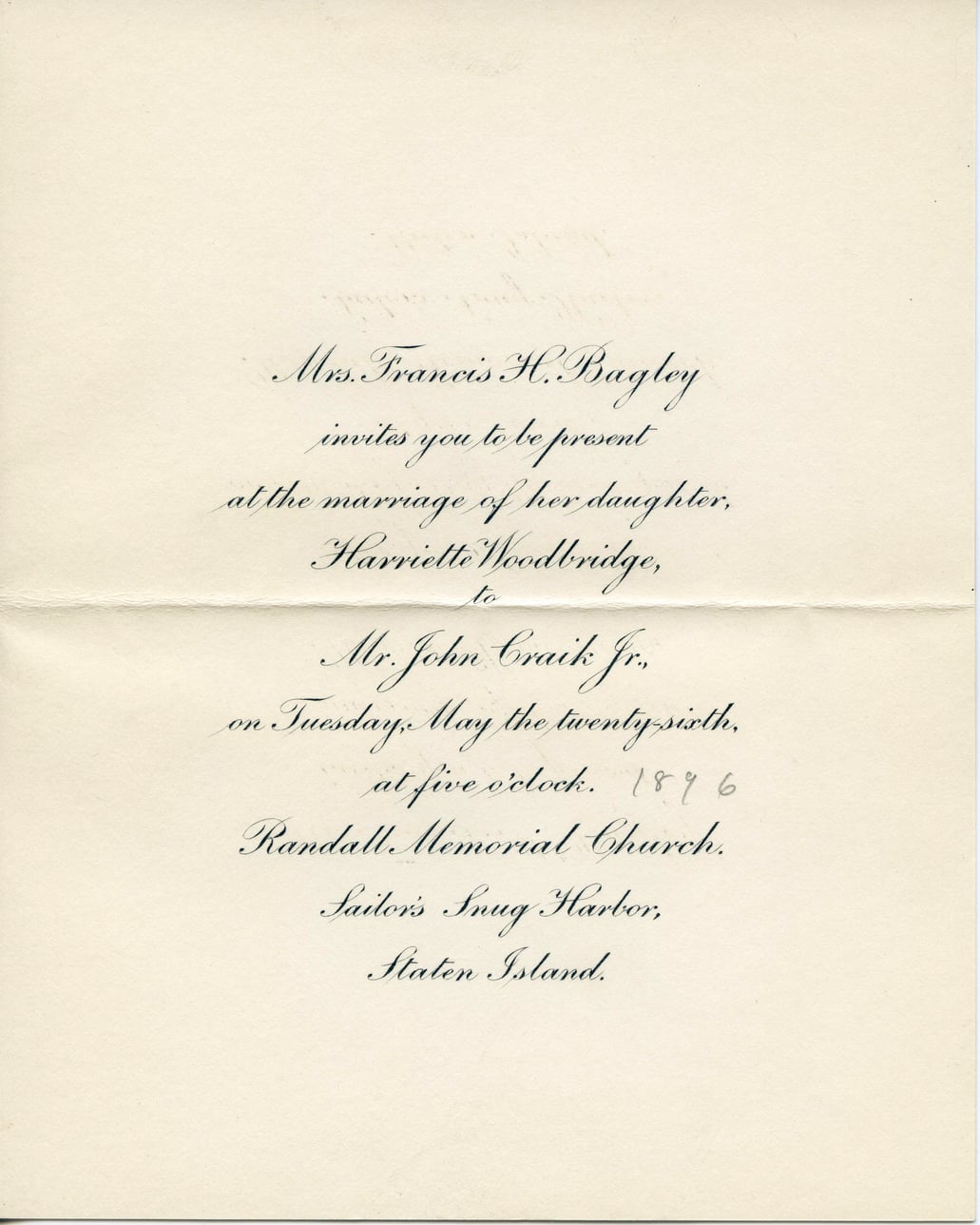 Mrs. Francis H. Bagley invites you to be present at the marriage of her daughter, Harriette Woodbridge, to Mr. John Craik Jr., on Tuesday, May the twenty-sixth, at five o'clock. 1896 Randall Memorial Church. Sailor's Snug Harbor, Staten Island.