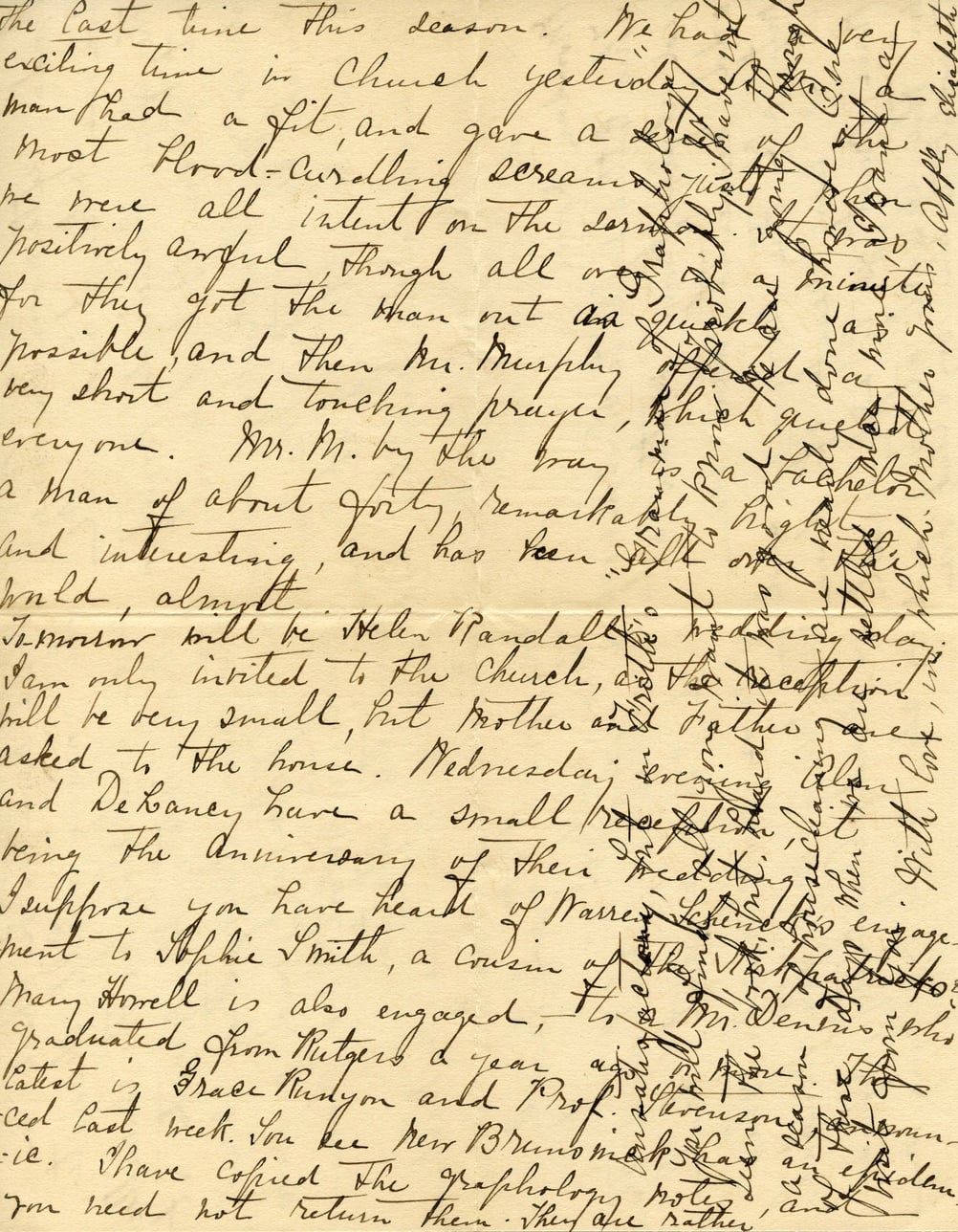 The past time this season. We had an exciting time in Church yesterday. A man had a fit, and gave a most blood-curdling scream just as we were all intent on the sermon. It was positively awful though all we could do for they got the man out as quickly as possible, and then Mr. Murphy offered us a very short and touching prayer, which quite touched everyone. Mr. M. by the way is a bachelor, a man of about forty, remarkably bright and interesting, and has been "first of his world," almost. Tomorrow will be Helen Randall's wedding day. I am only invited to the church, and the reception will be very small, but Mother and Father are asked to the house. Wednesday evening Albert and DeLancey have a small recep't like it being the anniversary of their wedding. I suppose you have heard of Warren Lehenius' engagement to Alphie Smith, a cousin of Mrs. Dennis who graduated from Rutgers a year ago. The latest is Grace Rendyon and Prof. Thomson's son graduated last week. You see New Brunswick has an epidemic. I have copied the graphology notes, and you need not return them. They are rather