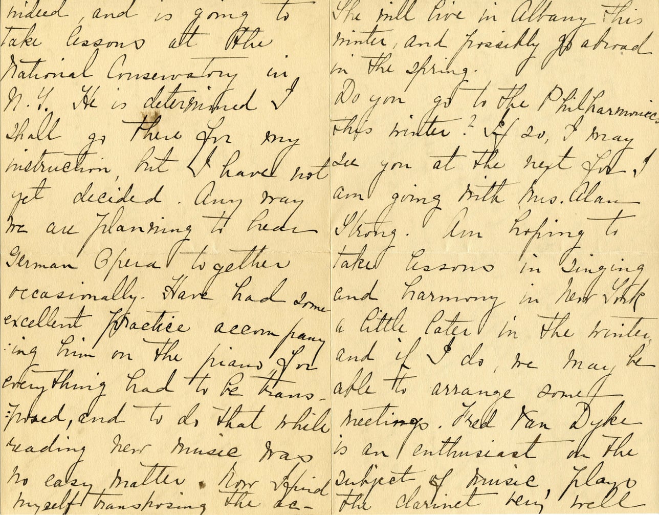 @steinway_piano:object {manufacturer: "Steinway & Sons"}rided, and is going to take lessons at the National Conservatory in N.Y. He is determined I shall go there for my instruction, but I have not yet decided. Any way we are planning to hear German Opera together occasionally. Have had some excellent practice accompanying him on the piano, for everything had to be transposed, and to do that while reading new music was no easy matter. Now find myself transposing the de- She will live in Albany this winter, and possibly go abroad in the spring. Do you go to the Philharmonic this winter? If so, I may see you at the next J.W.T. I am going with Mrs. Alan Strong. Am hoping to take lessons in singing and harmony in New York a little later in the winter, and if I do, he may be able to arrange some meetings. Fred Van Dyke is an enthusiast on the subject of music, plays the clarinet very well.