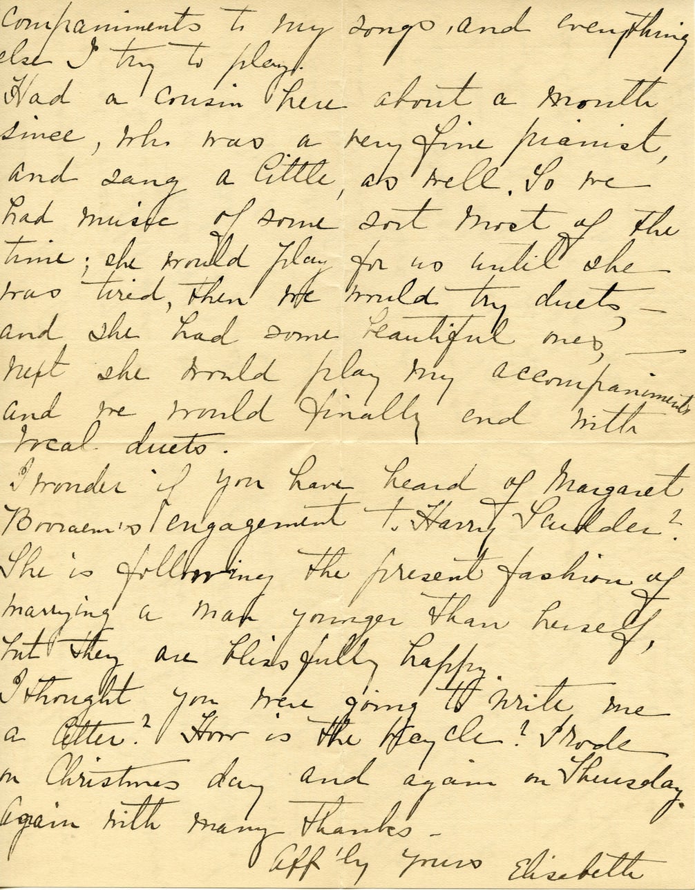 Companions to my songs, and everything else I try to play. Had a cousin here about a month since, who was a very fine pianist, and sang a little, as well. So we had music of some sort most of the time; she would play for us until she was tired, then we would try duets—and she had some beautiful ones,—next she would play my accompaniments and we would finally end with vocal duets. I wonder if you have heard of Margaret Braham's engagement to Harry Faulder? She is following the present fashion of marrying a man younger than herself, but they are blissfully happy. I thought you were going to write me a letter? How is the Hayle? I wrote on Christmas day and again on Thursday. Again with many thanks— Aff'ly yours, Elisabeth