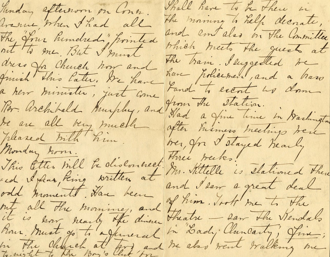 Sunday afternoon on Conner Avenue, when I had all the "Four Hundred" pointed out to me. But I must dress for church now and finish this later. We have a new minister, just come Rev. Archibald Murphy, and we are all very much pleased with him. Monday noon. This letter will be disconnected I fear, being written at odd moments. Have been out all the morning, and it is now nearly the dinner hour. Must go to a funeral in the Church at two, and to-night to the Boy's Club for I shall have to be there in the morning to help decorate, and am also on the Committee which meets the guests at the train. I suggested we have policemen, and a brass band to escort us down from the Station. Had a fine time in Washington after business meetings were over, for I stayed nearly three weeks! Mrs. Kittelle is stationed there and I saw a great deal of him. Took me to the Theatre—saw The Kendals in "Lady Clancarty," Fine; he also went walking me