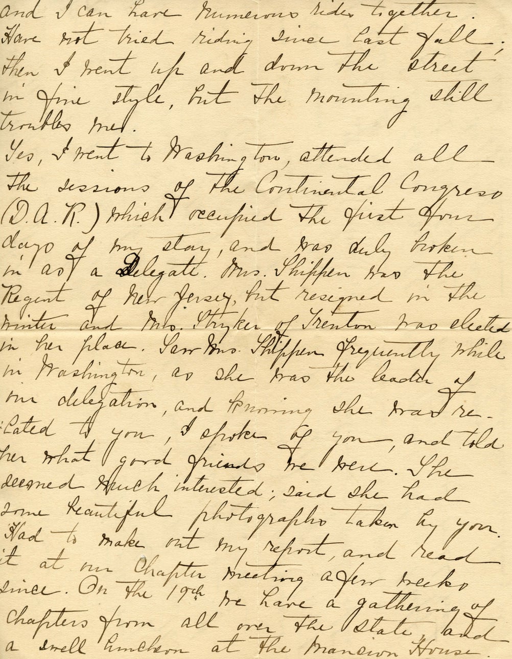 and I can have numerous rides together. Have not tried riding since last fall; then I went up and down the street in fine style, but the mounting still troubles me. Yes, I went to Washington, attended all the sessions of the Continental Congress (D.A.R.) which occupied the first four days of my stay, and was duly broken in as a delegate. Mrs. Shippen was the Regent of New Jersey, but resigned in the winter and Mrs. Trykker of Trenton was elected in her place. Saw Mrs. Shippen frequently while in Washington, as she was the leader of our delegation, and knowing she was related to you, I spoke of you, and told her what good friends we were. She seemed much interested; said she had some beautiful photographs taken by you. Had to make out my report, and read it at our Chapter meeting a few weeks since. On the 19th we have a gathering of chapters from all over the State, and a swell luncheon at the Mansion House.
