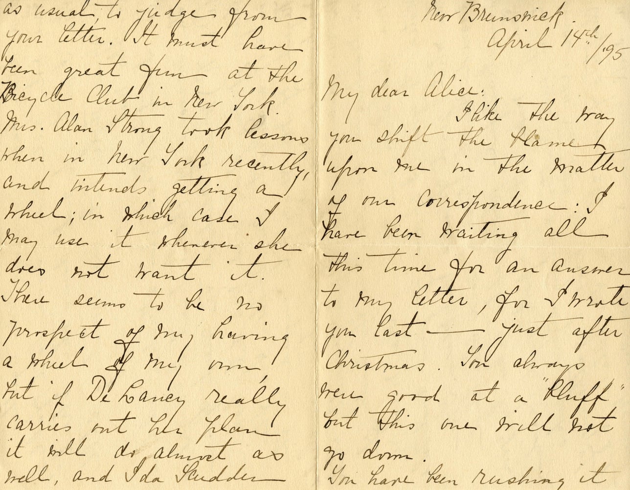 as usual, to judge from your letter. It must have been great fun at the Bicycle Club in New York. Mrs. Alan Strong took lessons when in New York recently, and intends getting a wheel; in which case I may use it whenever she does not want it. There seems to be no prospect of my having a wheel of my own, but if De Laney really carries out her plan it will do almost as well, and Ida Puddler New Brunswick April 14th/95 My dear Alice: I like the way you shift the blame upon me in the matter of our correspondence: I have been waiting all this time for an answer to my letter, for I wrote you last—just after Christmas. You always were good at a "bluff" but this one will not go down. You have been rushing it