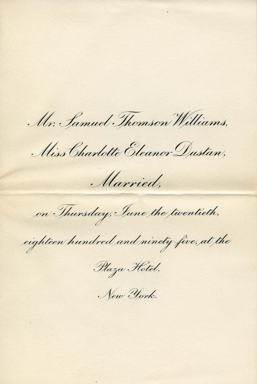 Mr. Samuel Thomson Williams, Miss Charlotte Eleanor Dustan, Married, on Thursday, June the twentieth, eighteen hundred and ninety-five, at the Plaza Hotel, New York.