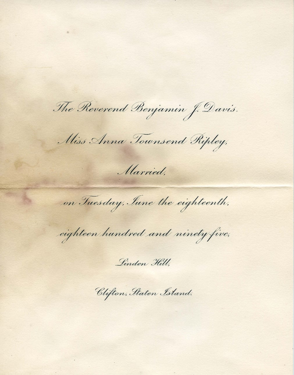 The Reverend Benjamin J. Davis. Miss Anna Townsend Ripley, Married, on Tuesday, June the eighteenth, eighteen hundred and ninety-five, Linden Hill, Clifton, Staten Island.