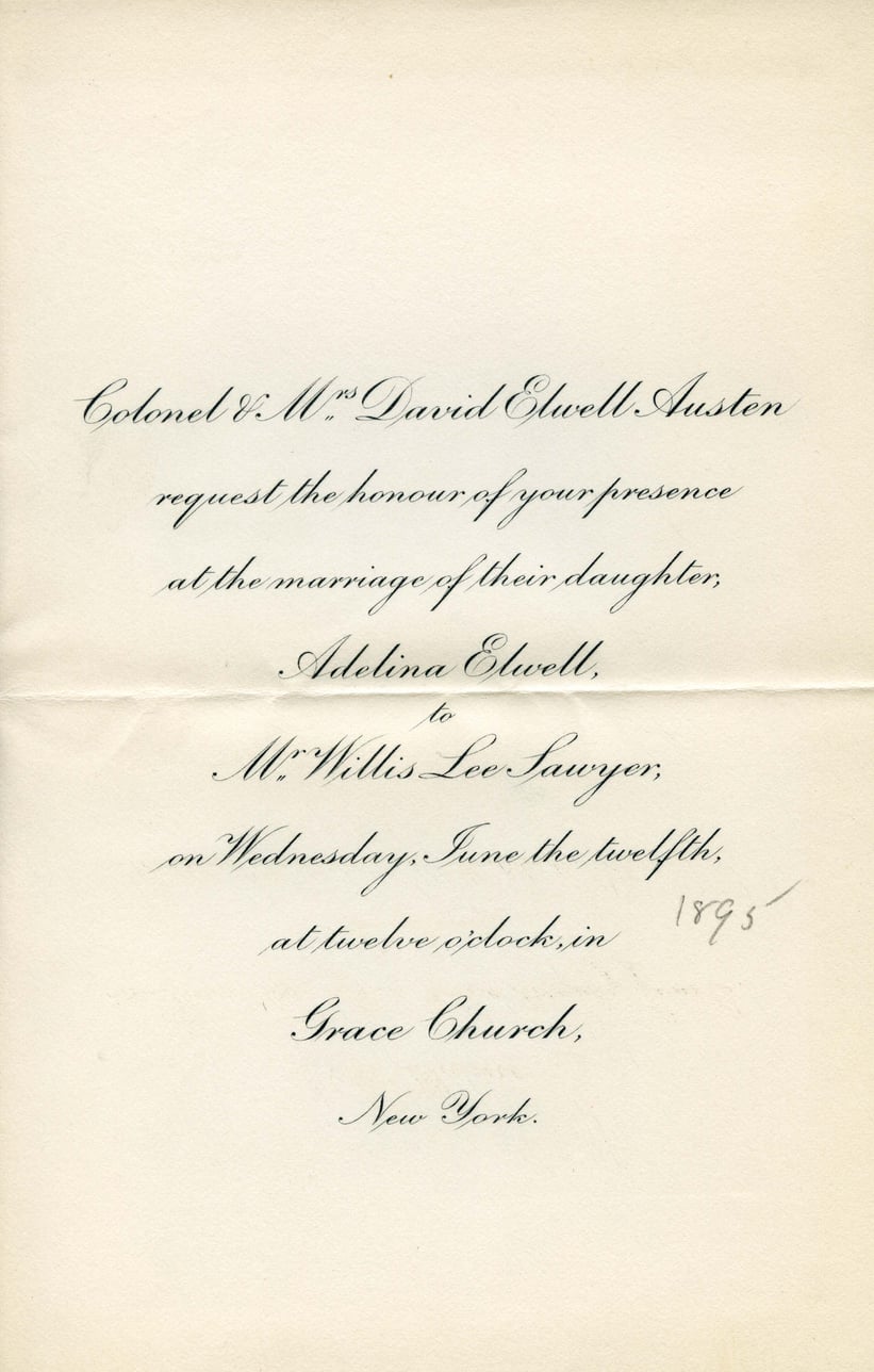 Colonel & Mrs David Elwell Austen request the honour of your presence at the marriage of their daughter, Adelina Elwell, to Mr Willis Lee Sawyer, on Wednesday, June the twelfth, at twelve o'clock, in Grace Church, New York.