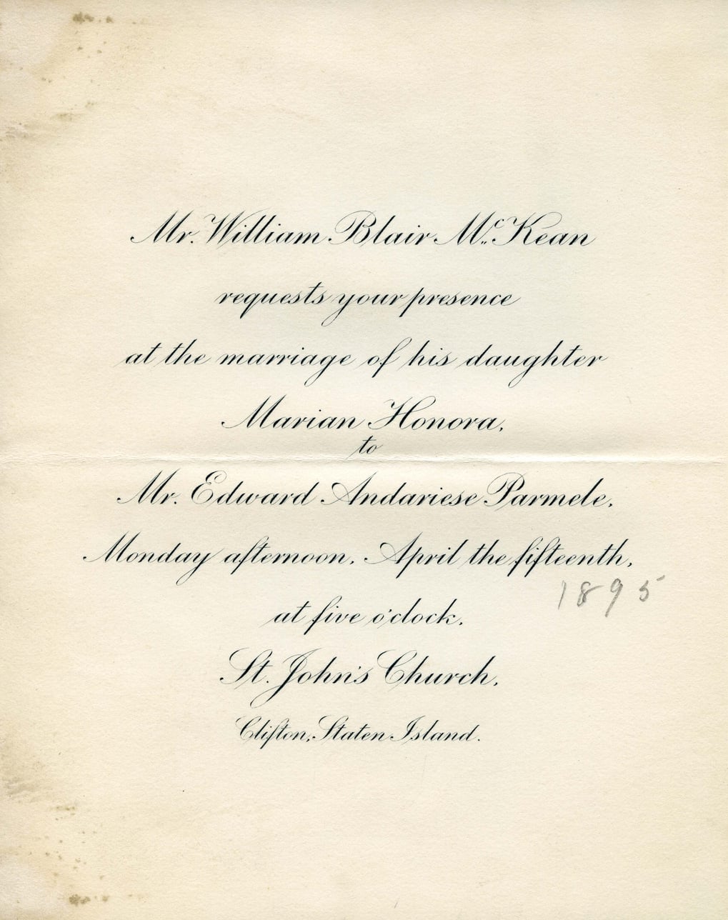 @wedding_collection -> includes -> @wedding_caroline_simonsonMr. William Blair McKean requests your presence at the marriage of his daughter Marian Honora, to Mr. Edward Andariese Parmele. Monday afternoon, April the fifteenth, at five o'clock. St. John's Church. Clifton, Staten Island.