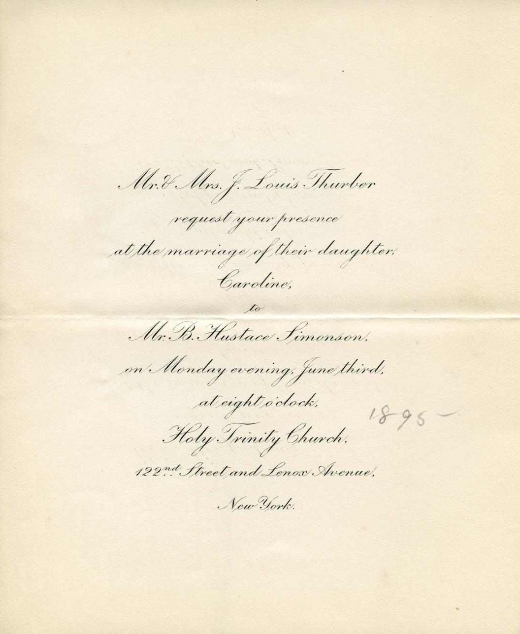 Mr. & Mrs. J. Louis Thurber request your presence at the marriage of their daughter, Caroline, to Mr. B. Hustace Simonson, on Monday evening, June third, at eight o'clock, Holy Trinity Church, 122nd Street and Lenox Avenue, New York.