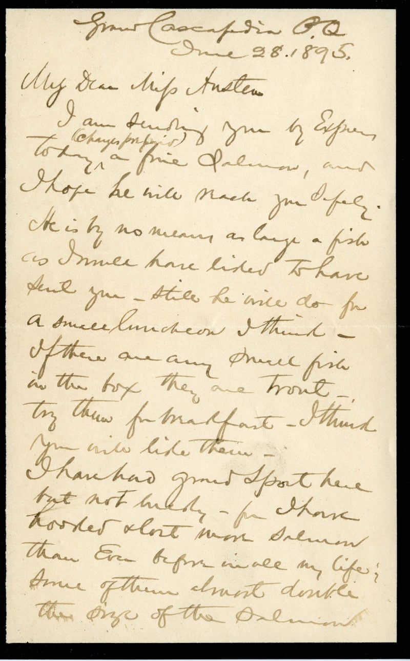 @robert_c_lowry -> sent -> @salmon_fishing_letter_1895_06_28_1 {item: "salmon", via: "Express"}Grand Cascapedia P.Q. June 28, 1895. My Dear Miss Austen, I am sending you by Express today a fine Salmon, and I hope he will reach you safely. He is by no means as large a fish as I would have liked to have sent you—still he will do for a small luncheon I think—if there are any small fish in the box they are trout—try them for breakfast—I think you will like them. I have had good sport here but not likely—for I have hooked & lost more Salmon than ever before in all my life; some of them almost double the size of the Salmon.