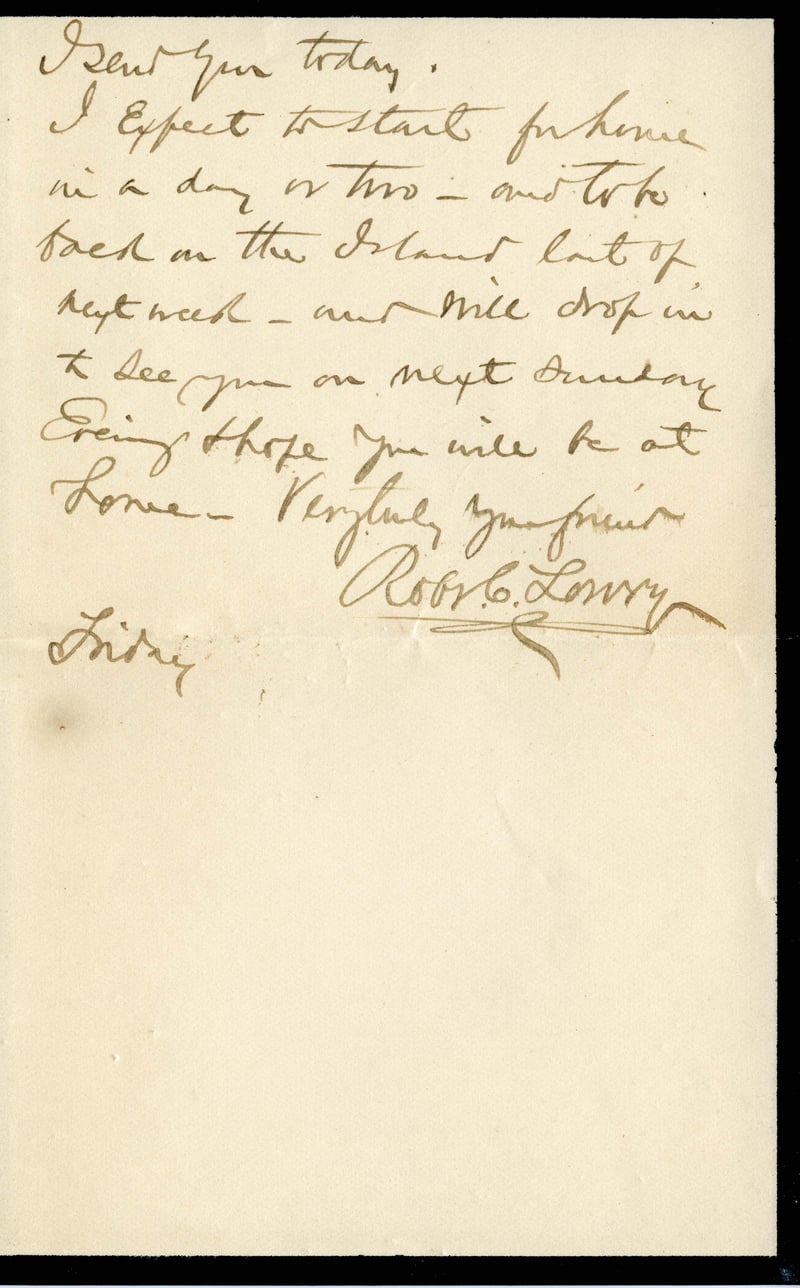 I sent you today. I expect to start for home in a day or two—and to be back on the Island last of next week—and will drop in to see you on next Sunday evening. Hope you will be at home. Very truly your friend, Robt C. Lowry Liddy