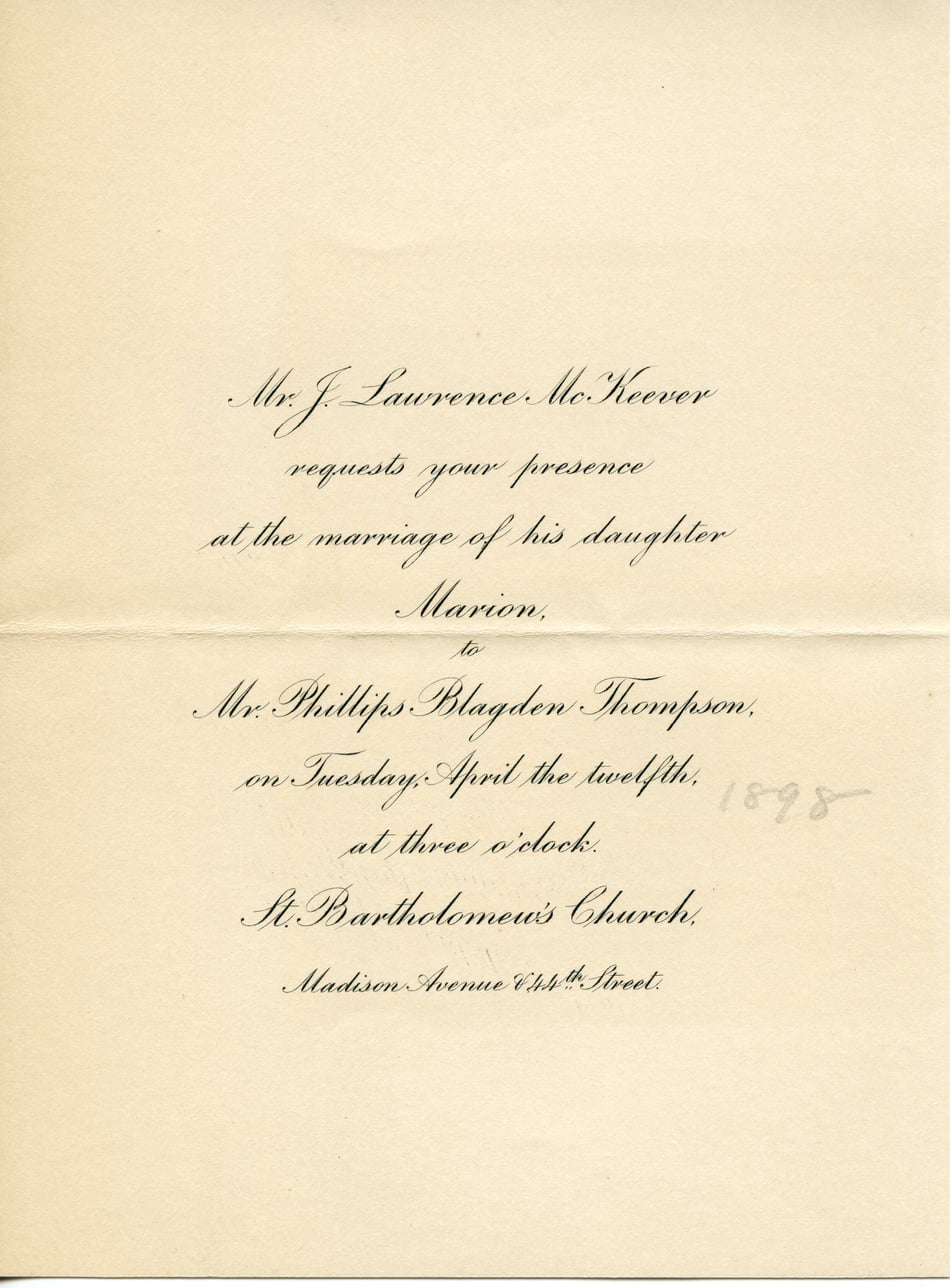 Mr. J. Lawrence McKeever requests your presence at the marriage of his daughter Marion, to Mr. Phillips Blagden Thompson, on Tuesday, April the twelfth, at three o'clock. St. Bartholomew's Church, Madison Avenue & 44th Street.