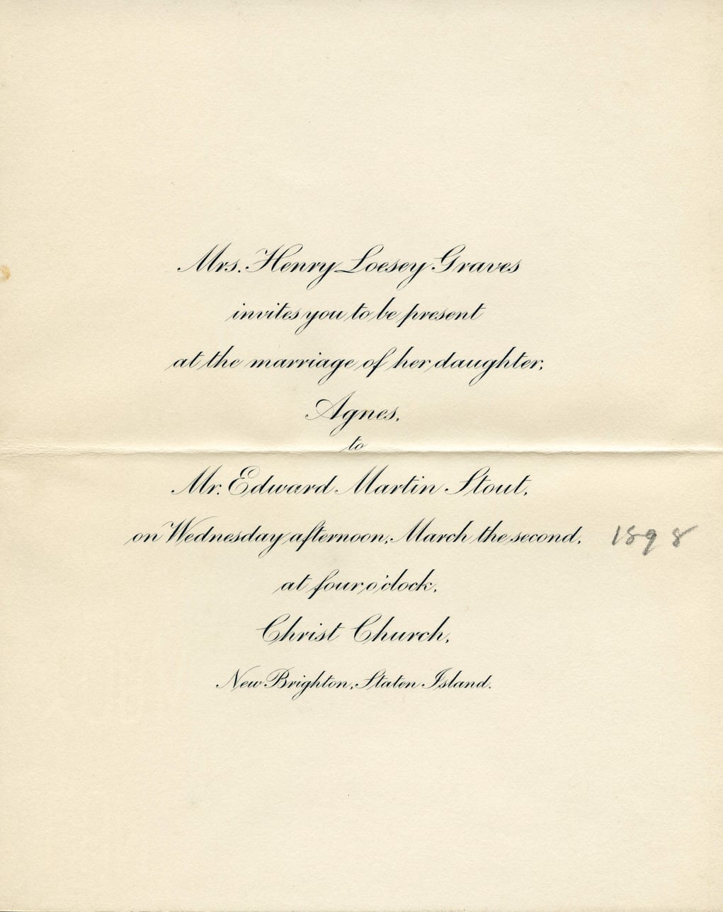 @austen_family_wedding_invitations_collection -> contains -> [@invitation_agnes, @invitation_marion]Mrs. Henry Loesey Graves invites you to be present at the marriage of her daughter, Agnes, to Mr. Edward Martin Stout, on Wednesday afternoon, March the second, 1898 at four o'clock. Christ Church, New Brighton, Staten Island.