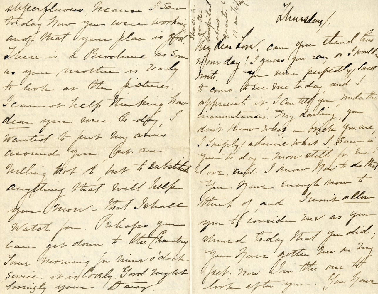 superfluous, because I saw today how you were working and that Lynn plan is good. There is a Brochure as soon as your mother is ready to look at the pictures. I cannot help thinking how dear you were today; I wanted to put my arms around you but am willing not to but to substitute anything that will help you know—that I shall watch for. Perhaps you can get down to the Chantry your morning for nine o'clock service—it is lovely. Good night lovingly yours Daisy. Thursday, My dear Love, can you stand two of me day? I guess you can, or I wouldn't write. If you were perfectly sweet & come to see me today and I appreciate it I can tell you, under the circumstances. My darling, you don't know what a wish you are; I simply admire what I saw in you today—you still for me I love, and I know I do that. You have enough now to think of and I won't allow you to consider me as you seemed today that you did; you have gotten me on my feet. Now I'm the one to look after you. You have