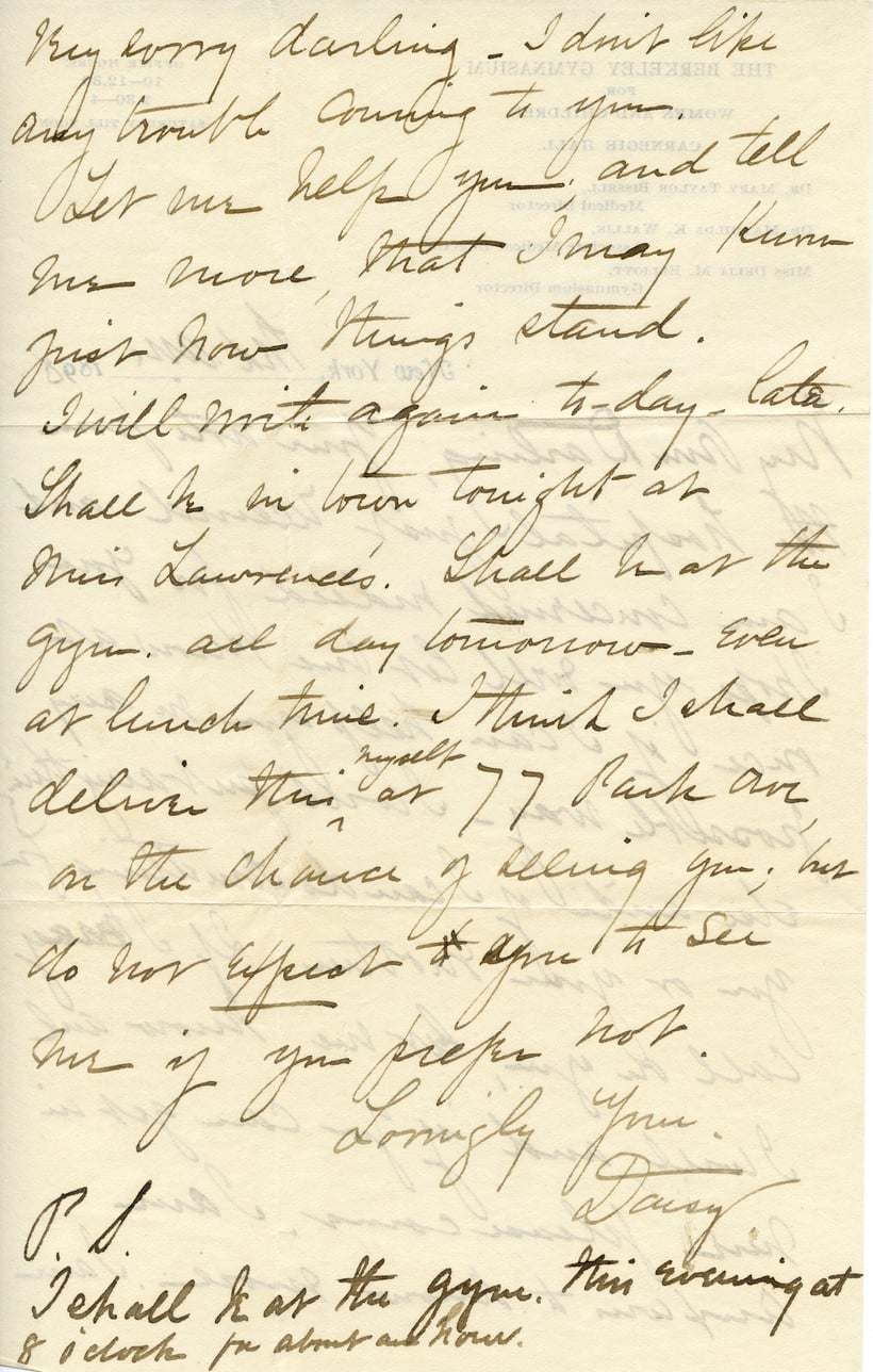 Very sorry darling - I don't like any trouble coming to you. Get our help Lynn, and tell us more that I may know just how things stand. I will write again today later. I shall be in town tonight at Miss Lawrence's. I shall be at the gym all day tomorrow - even at lunch time. I think I shall deliver this myself at 77 Park Ave, on the chance of seeing you; but do not expect to see me if you prefer not. Lovingly yours, Daisy P.S. I shall be at the gym this evening at 8 o'clock for about an hour.