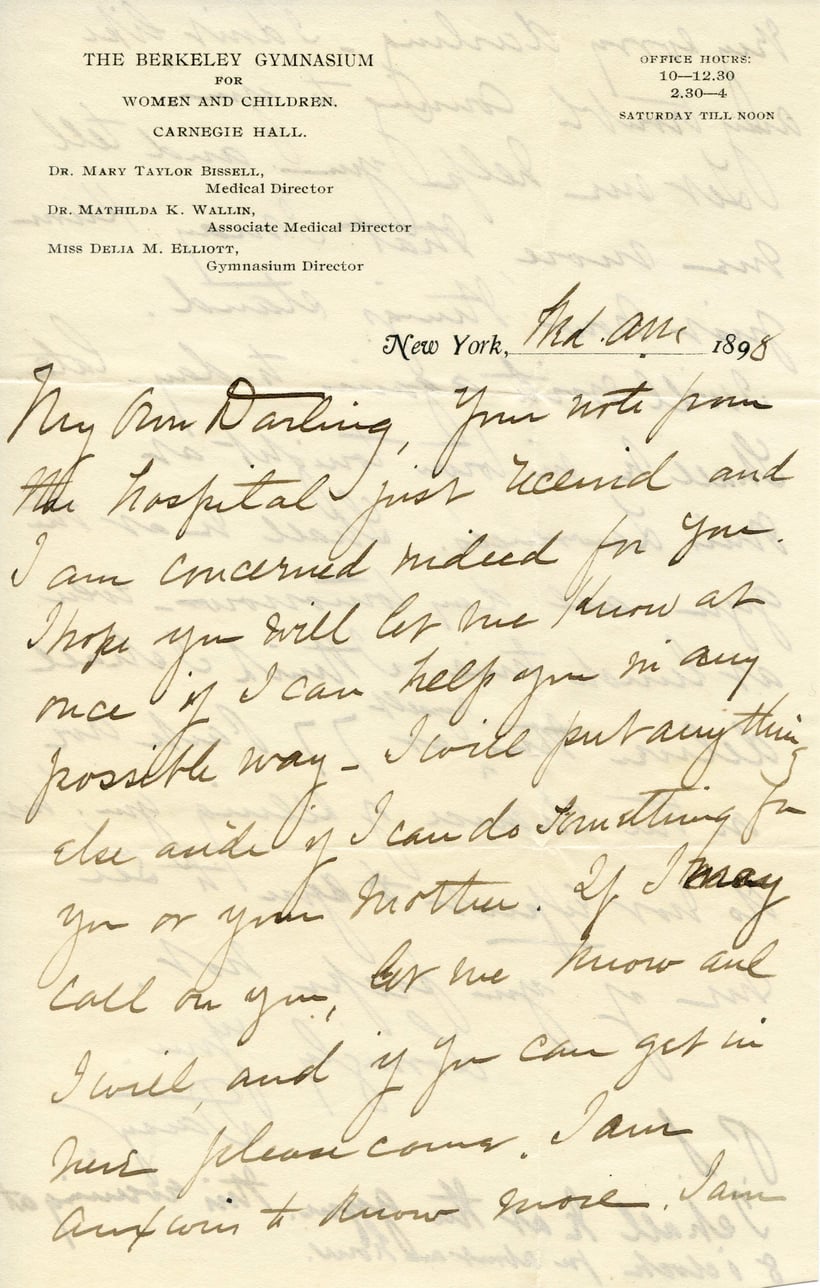THE BERKELEY GYMNASIUM FOR WOMEN AND CHILDREN. CARNEGIE HALL. OFFICE HOURS: 10—12:30 2.30—4 SATURDAY TILL NOON Dr. Mary Taylor Bissell, Medical Director Dr. Mathilda K. Wallin, Associate Medical Director Miss Delia M. Elliott, Gymnasium Director New York, Feb. 2nd, 1898 My Own Darling, Your note from the hospital I just received and I am concerned indeed for you. I hope you will let me know at once if I can help you in any possible way—I will put anything else aside if I can do something for you or your mother. If I may call on you, let me know and I will, and if you can get in here please come. I am anxious to know more. I am