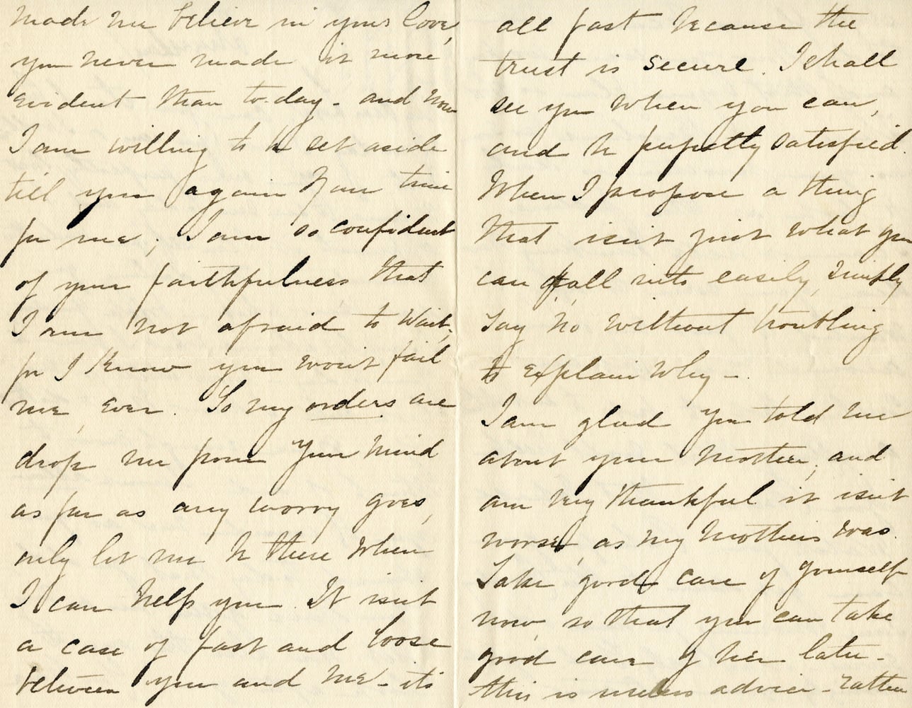 made me believe in your love, you never made it more evident than today—and now I am willing to let it abide till you again have time for me. I am so confident of your faithfulness that I am not afraid to wait, for I know you won't fail me ever. If my orders are dropped from your mind as far as any worry goes, only let me be there when I can help you. It isn't a case of fast and loose between you and me—it's all fast because the trust is secure. I shall see you when you can, and be perfectly satisfied. When I propose a thing that isn't just what you can fall into easily, simply say no without troubling to explain why. I am glad you told me about your mother, and am very thankful it isn't worse as my mother was. Take good care of yourself now so that you can take good care of her later. This is needless advice—rather