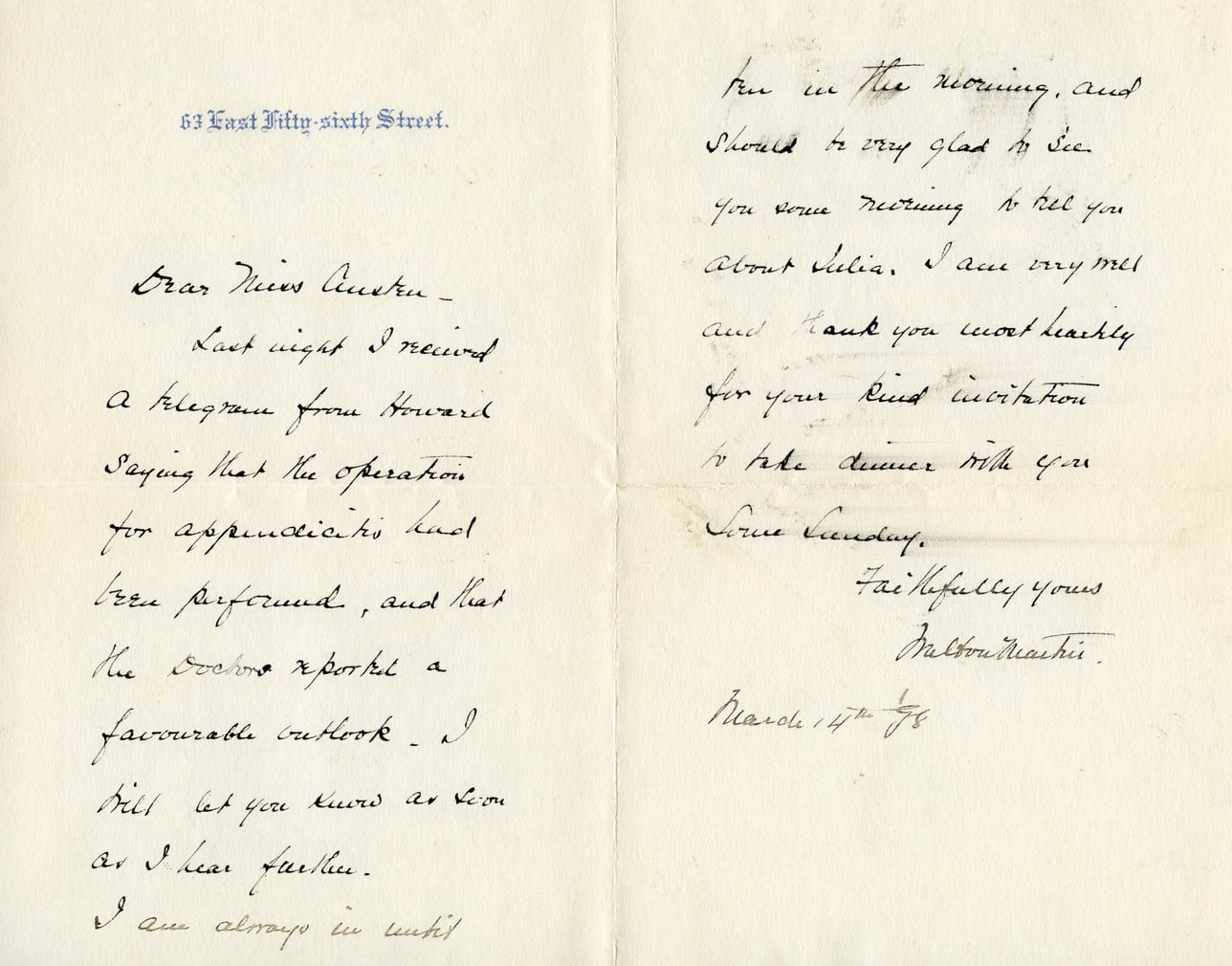 63 East Fifty-sixth Street. Dear Miss Austen, Last night I received a telegram from Howard saying that the operation for appendicitis had been performed, and that the doctors reported a favourable outlook. I will let you know as soon as I hear further. I am always in wish for in the morning, and should be very glad to see you some morning to tell you about Julia. I am very well and thank you most heartily for your kind invitation to take dinner with you some Sunday. Faithfully yours, Malvina Martin. March 14th 78