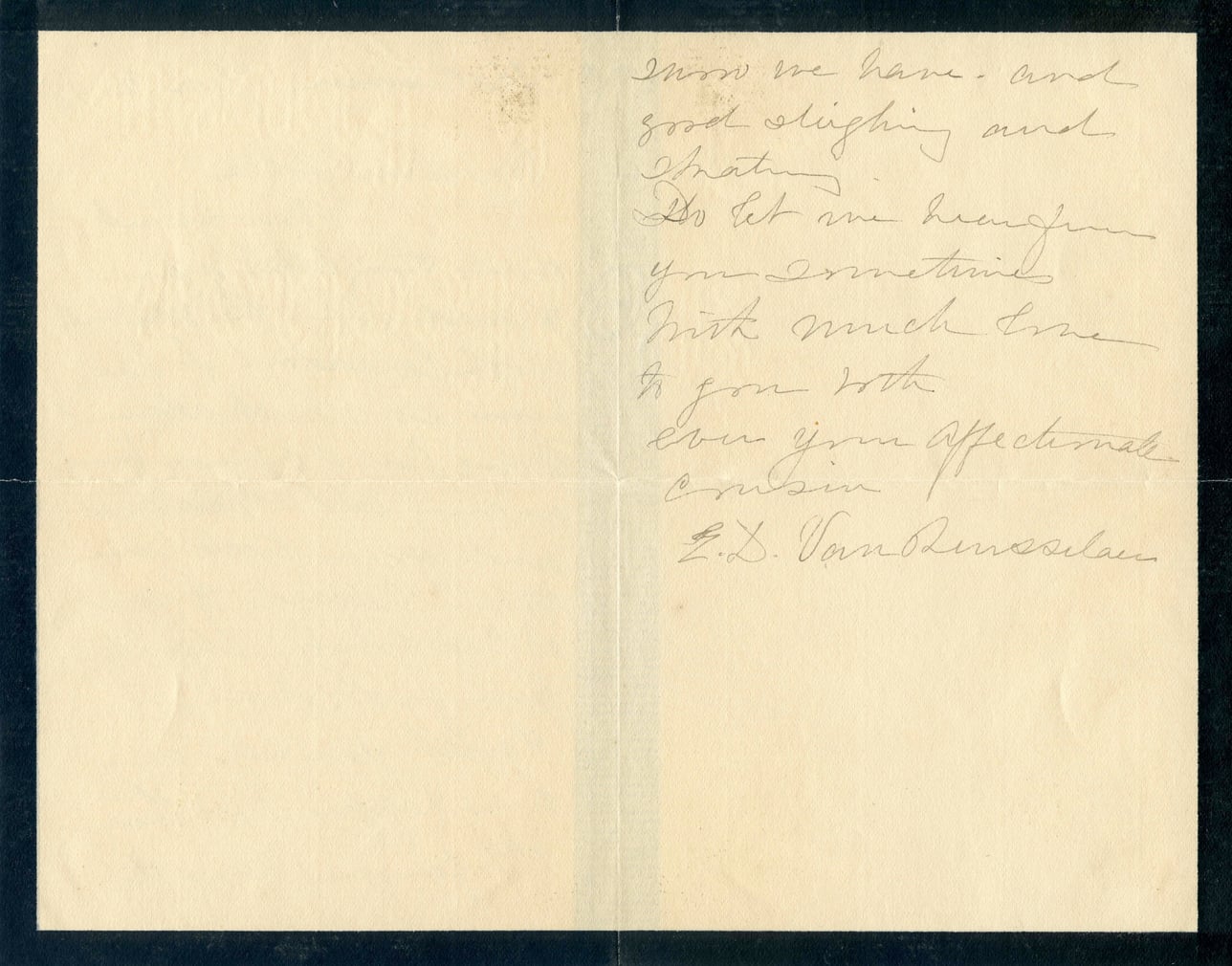 snow we have—and good sleighing and skating. Do let me hear from you sometime. With much love to you both, Your affectionate cousin, E.D. Van Dusenlan