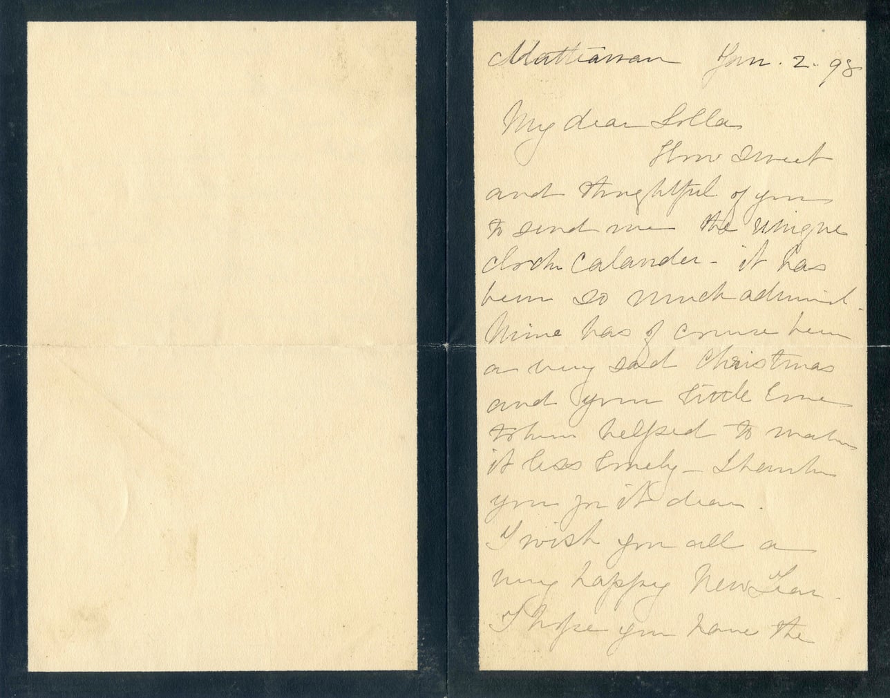 @image_fishkill_2:file {filename: "1898_1-2-1898 Jan 3002-fishkill copy.jpg", type: "image", ocr_text: "Mathiasen Jan. 2, 98 My dear Lolla, How sweet and thoughtful of you to send me the unique cloths calander..."}